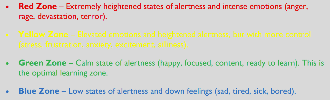 - Reinforce that all zones are normal, but some zones are better suited for certain activities (e.g., Green Zone for learning).